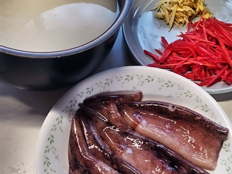 スルメイカ4杯、人参千切り 50g、生姜千切り 20gを具材で用意します。