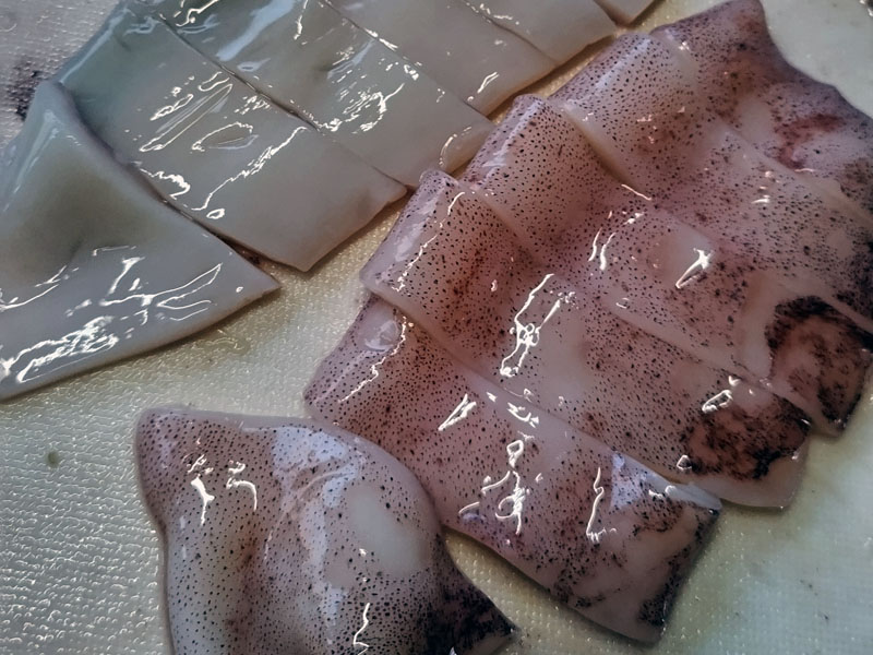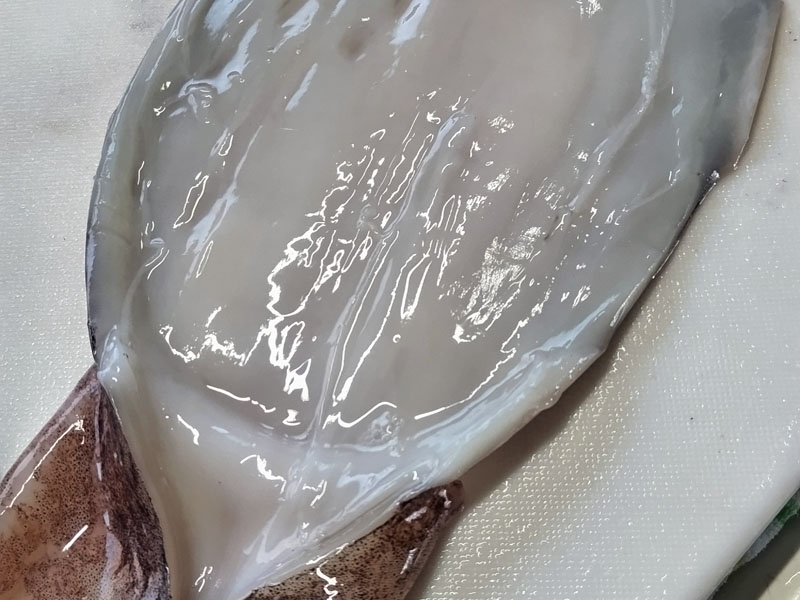 スルメイカは軟骨を取り除き、開いて大きめに切ってください。