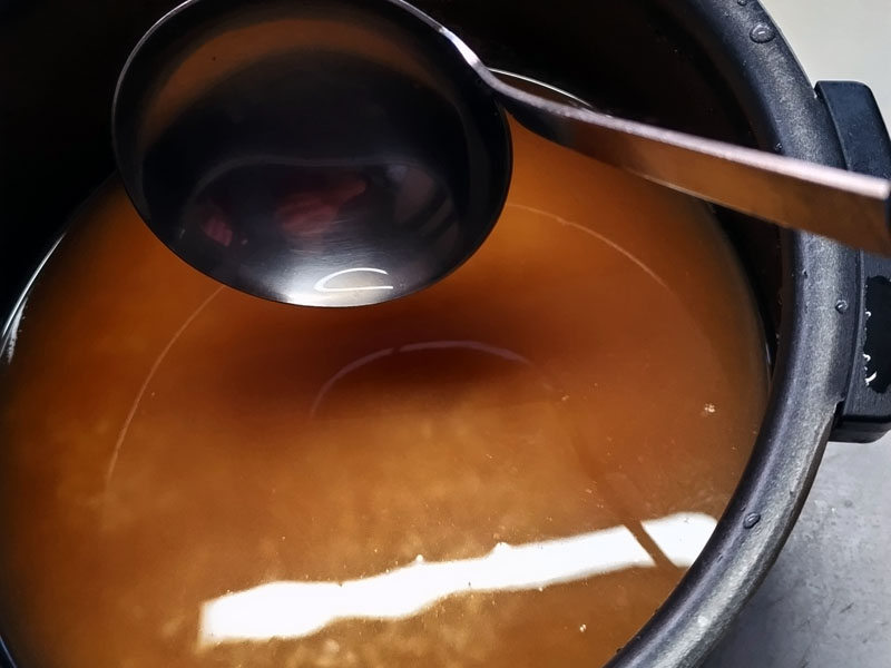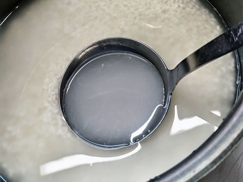 次に味付けは、炊飯窯に浸水した米と 水を3合分いれてください。そこからお玉2杯分の水をとります。